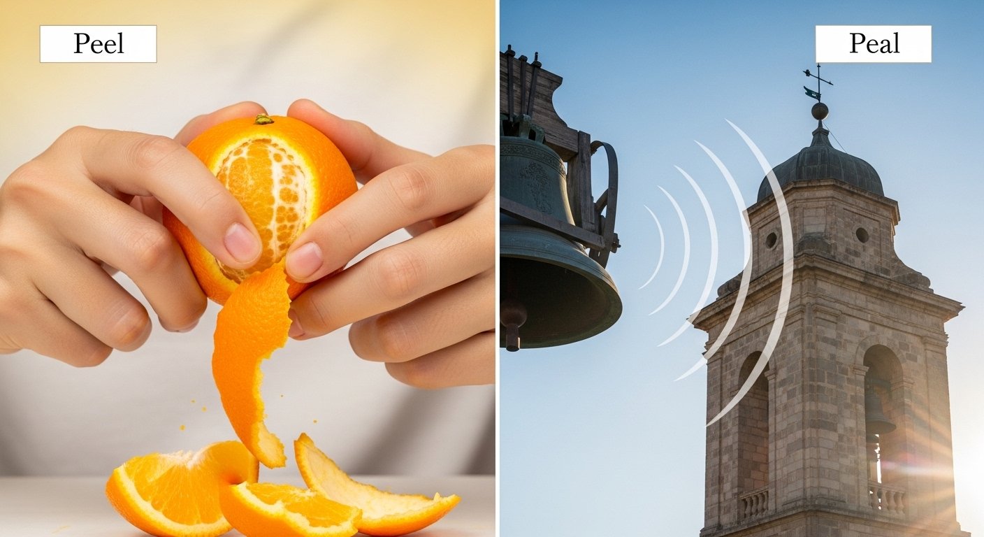 The difference between peel and peal is a classic example of English homophones—words that sound the same but have completely different meanings.