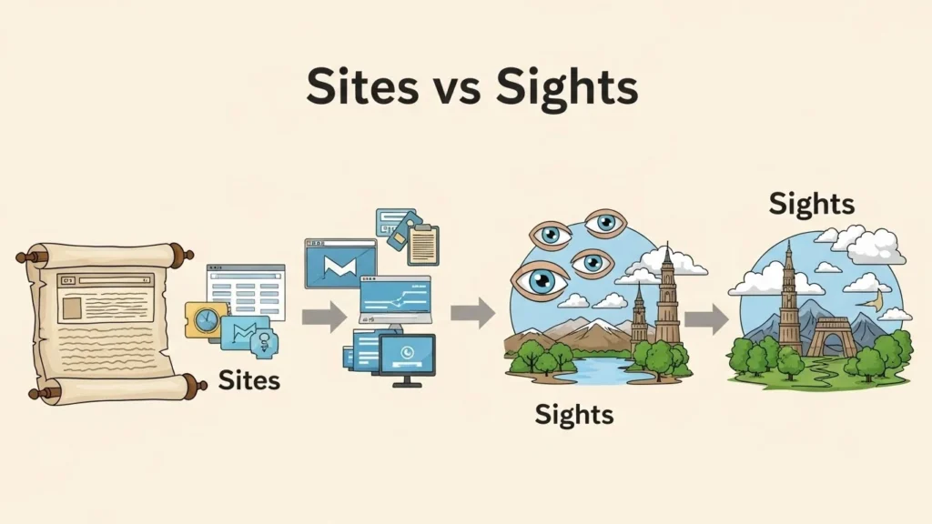 Have you ever written “beautiful sites” when you meant “beautiful sights”? If yes, you’re not alone. The confusion between sites or sights is one of the most common English mistakes, even among native speakers. Both words sound exactly the same, but they have very different meanings. That’s why so many people search for this keyword. They know one is wrong, but they’re not sure which one to use.